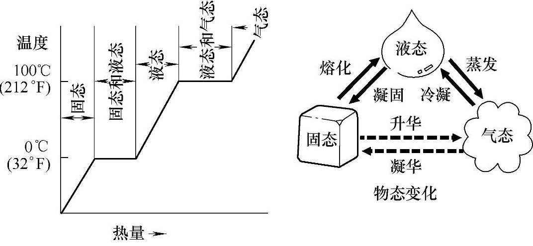 对冰加热,冰的温度会慢慢升高;当温度达到0℃时,冰就开始熔化,在这一阶段,0℃的水与冰共存;继续加热直至冰全部转变为0℃的水,这一固态转变为液态的过程称为熔化,而反过来的过程叫做凝固。对水加热,水从0℃升高到100℃。在100℃时,水的温度不再继续升高,而开始蒸发,直至水全部蒸发为水蒸气,水的加热过程如图1-12所示。水从液态变为气态的过程叫做汽化(蒸发),相反的过程称为冷凝。物质从固态直接转化为气体叫做升华,相反的过程叫凝华。