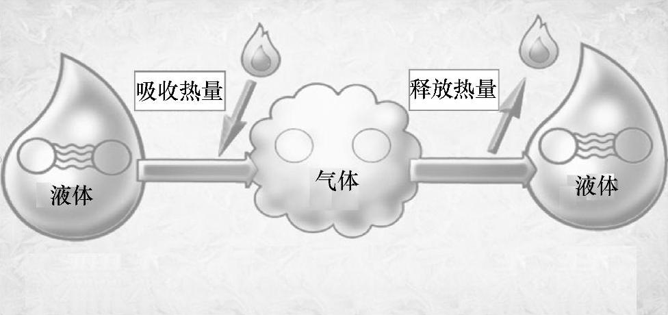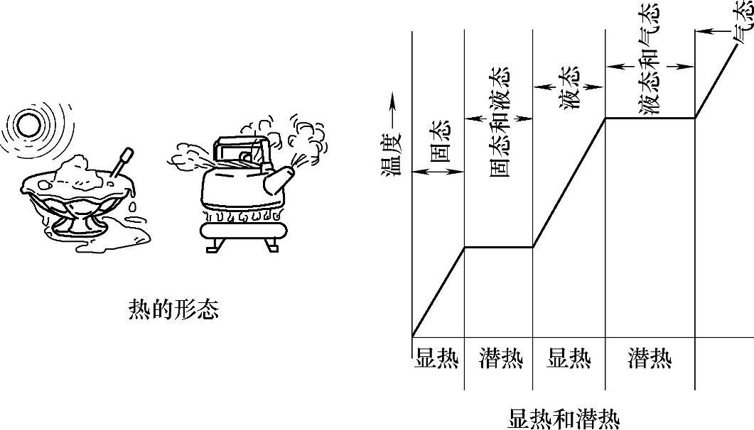 从水的加热过程我们可以看出,加热水时,水的温度会随加热量的增加而升高。当加热到100℃时,水的温度不再升高,而是从液态向气态转变(图1-12)。这说明了加给水的热量有两种结果,一种是使水的温度升高,另一种是使水的状态发生变化。我们将使物质温度升高的热量称为显热,将使物质状态发生变化的热量称为潜热(图1-13)。