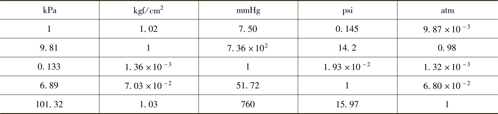 在实际使用中还有几个常用的压力单位,如工程大气压(kgf/cm 2 )、毫米汞柱(mmHg)、大气压(atm)及磅/平方英寸(psi)等。它们之间的换算关系见表1-2。