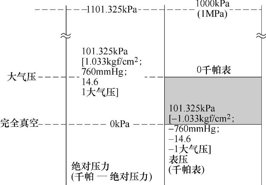 为了与绝对压力相区别,常在表压力的具体数字后面加一个(G)字,如10kPa(G)。真空度表示比标准大气压低多少的具体数量。它们之间的基本关系如图1-3所示。