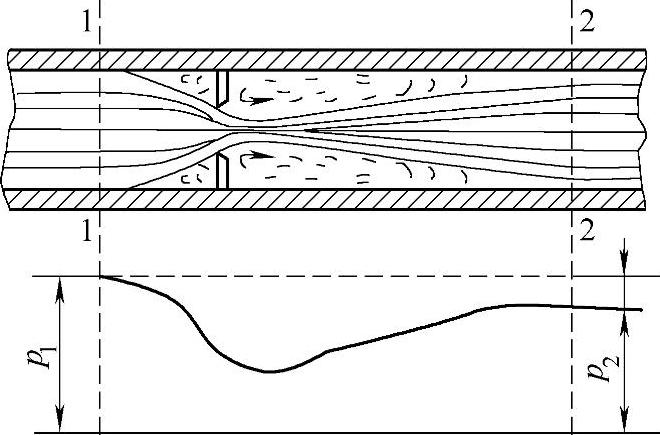 由于遇到突然缩小的狭窄通道,而使流体压力显著下降的现象,称为节流。气体或蒸气在管道中流动时,通道截面积突然缩小,如遇到阀门、孔板等,流体压力便下降。这种状态变化称为节流,如图1-14所示。