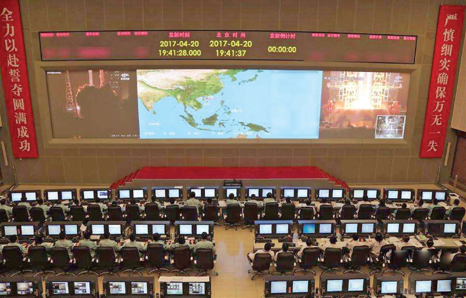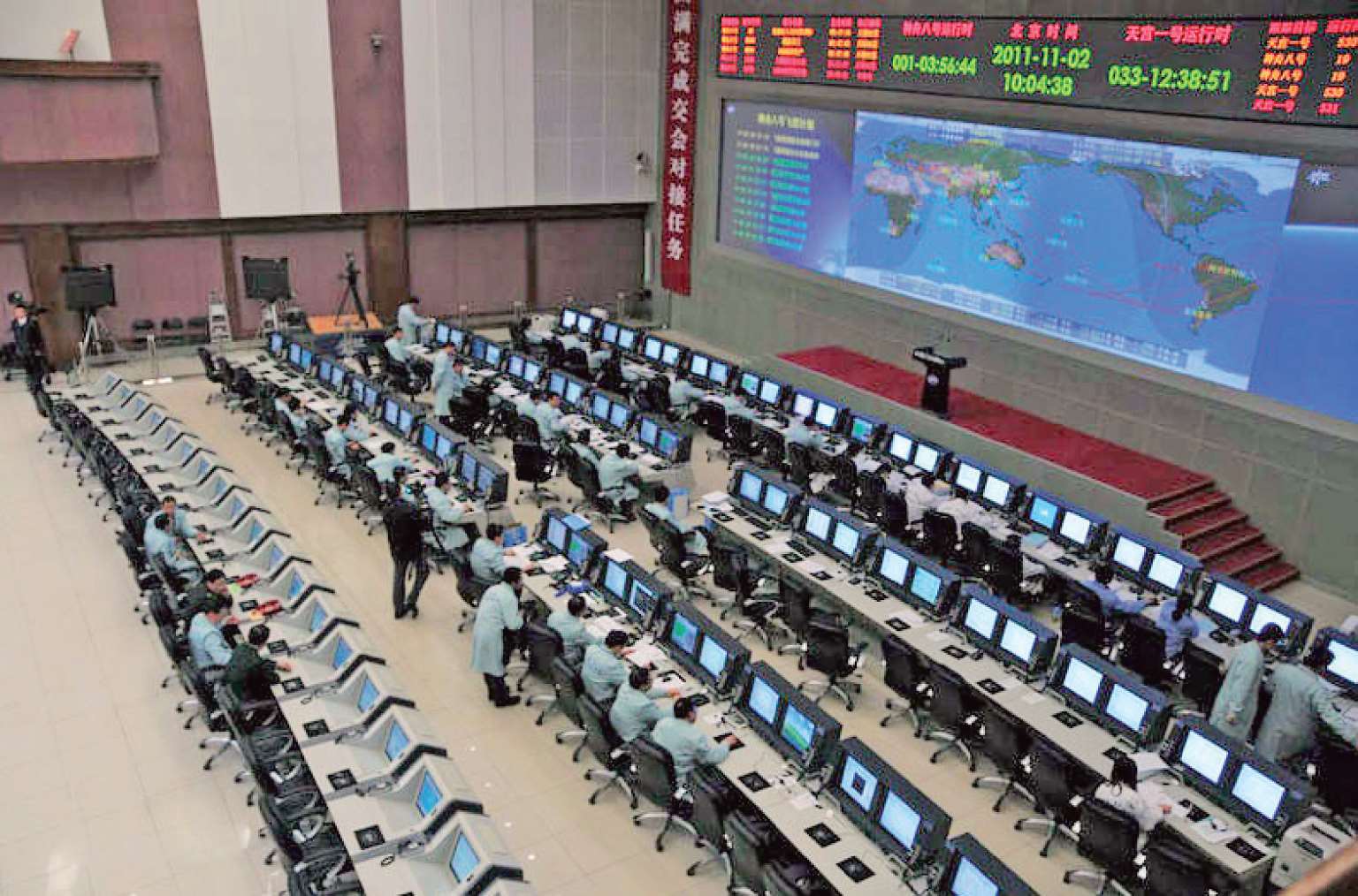 1996年3月北京航天指挥控制中心建成。4块巨幅大屏幕和几十台显示终端,显示着不断变化、标示着任务状况的数据、曲线和图像。大屏幕上方标示着北京时间、联调时间、飞行时间的LED显示屏,同时不断跳跃着各种飞行控制的数据。