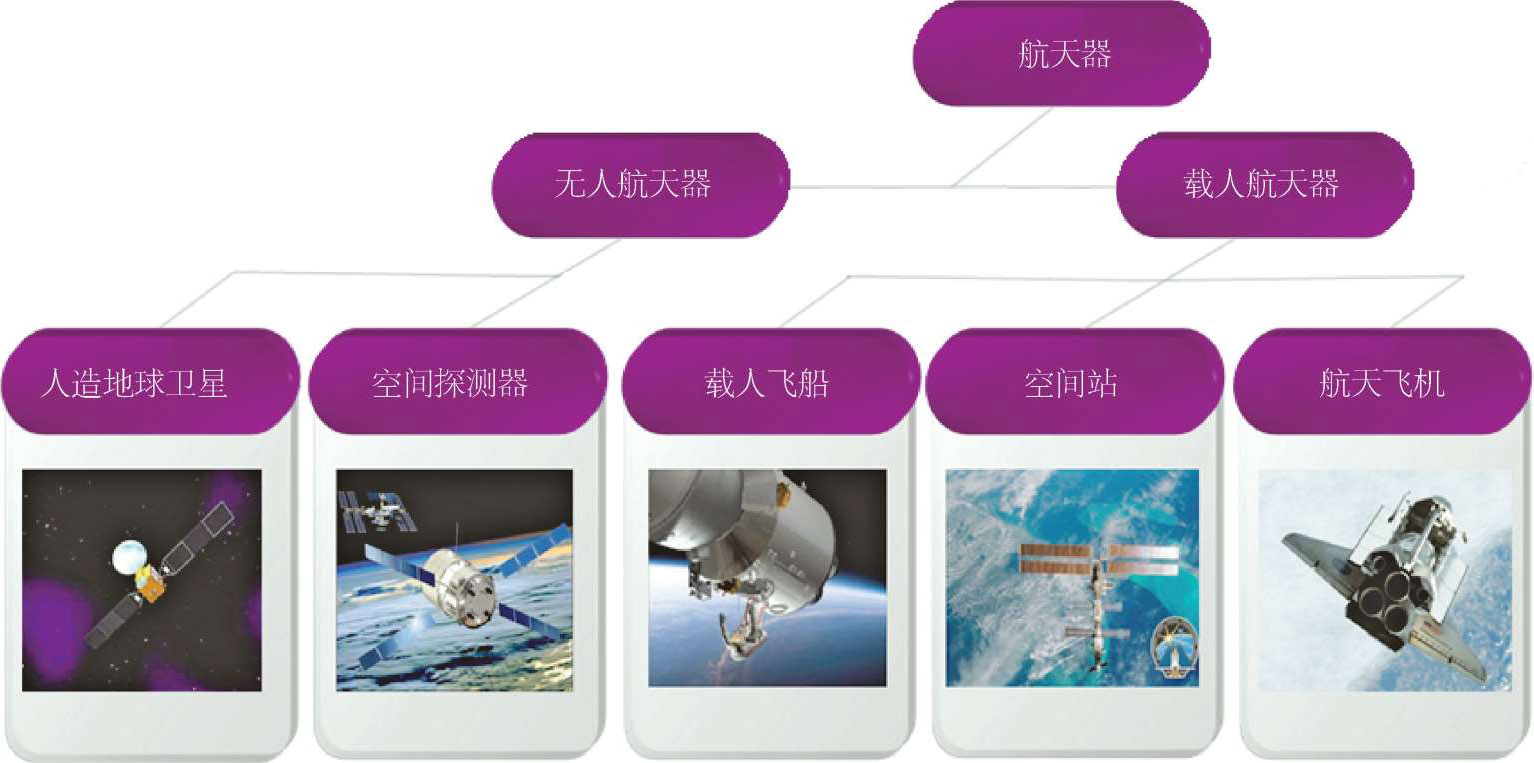 航天器根据是否载人,可分为无人航天器与载人航天器。无人航天器根据是否环绕地球运行,分为人造地球卫星和空间探测器;载人航天器包括载人飞船、空间站和航天飞机。