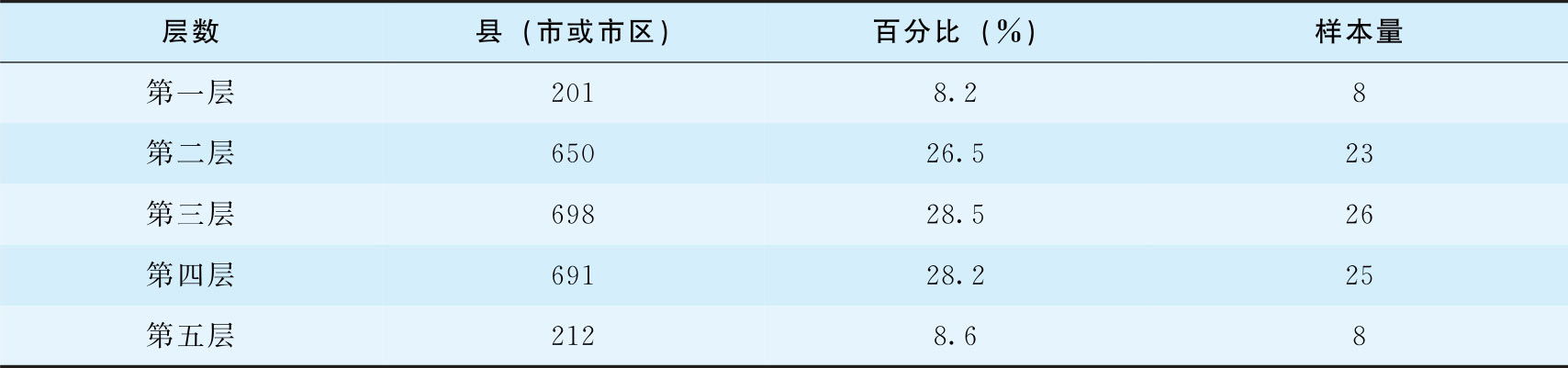 第四次国家卫生服务调查的第一阶段的抽样中,将全国所有的县(市或市区)按照一定的方法进行分层,最后分为五层,第一层有201个县(市或市区),占整个县(市或市区)的8.2%;第二层有650个县(市或市区),占26.5%;第三层有698个县(市或市区),占28.5%;第四层有691个县(市或市区),占28.2%;第五层有212个县(市或市区),占8.6%。按照一定的方法确定调查的县(市或市区)样本量为90,具体抽取的样本为:第一层抽取了8个县(市或市区);第二层抽取了23个县(市或市区);第三层抽取了26个县(市或市区);第四层抽取了25个县(市或市区);第五层抽取了8县(市或市区)。