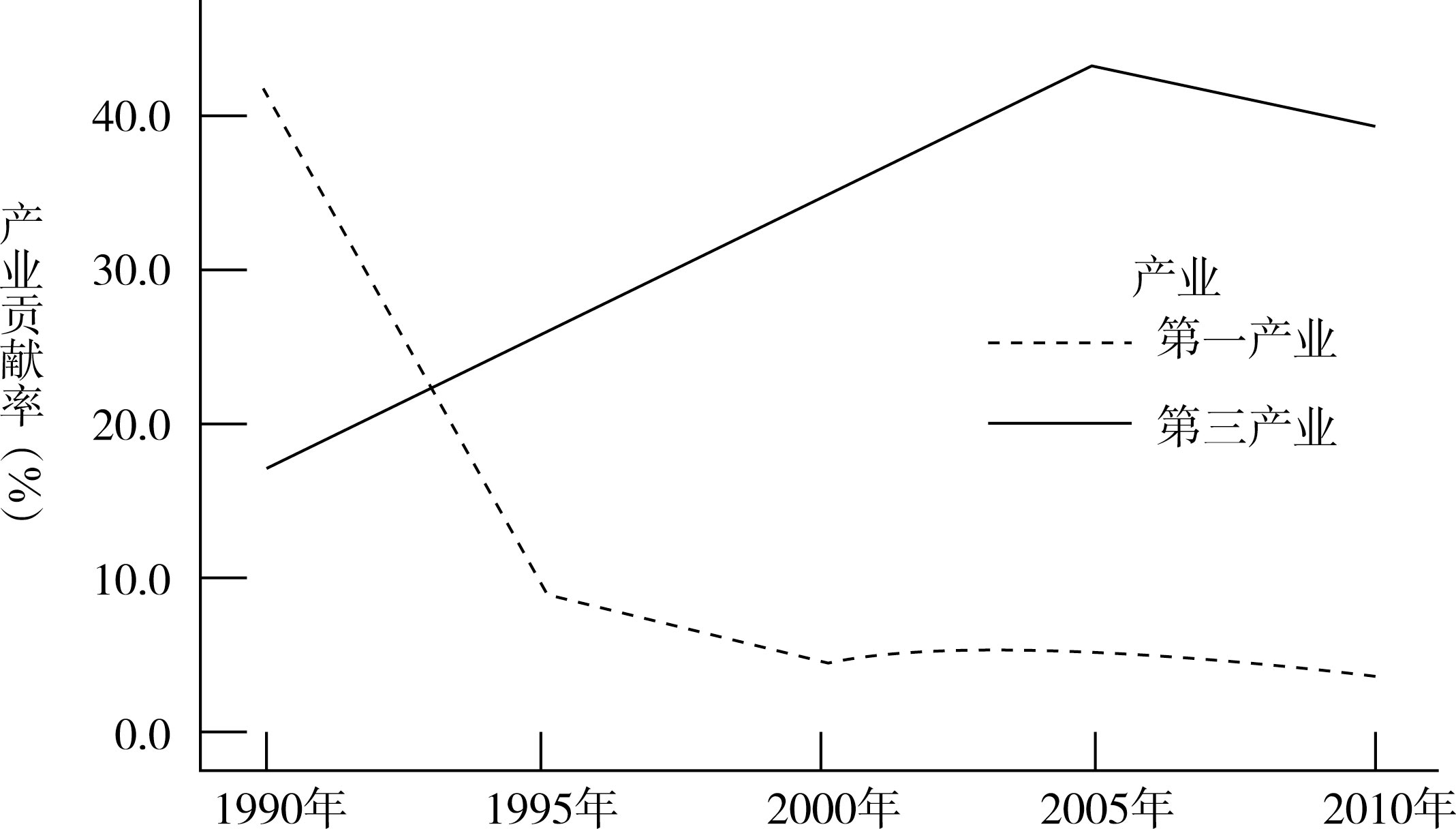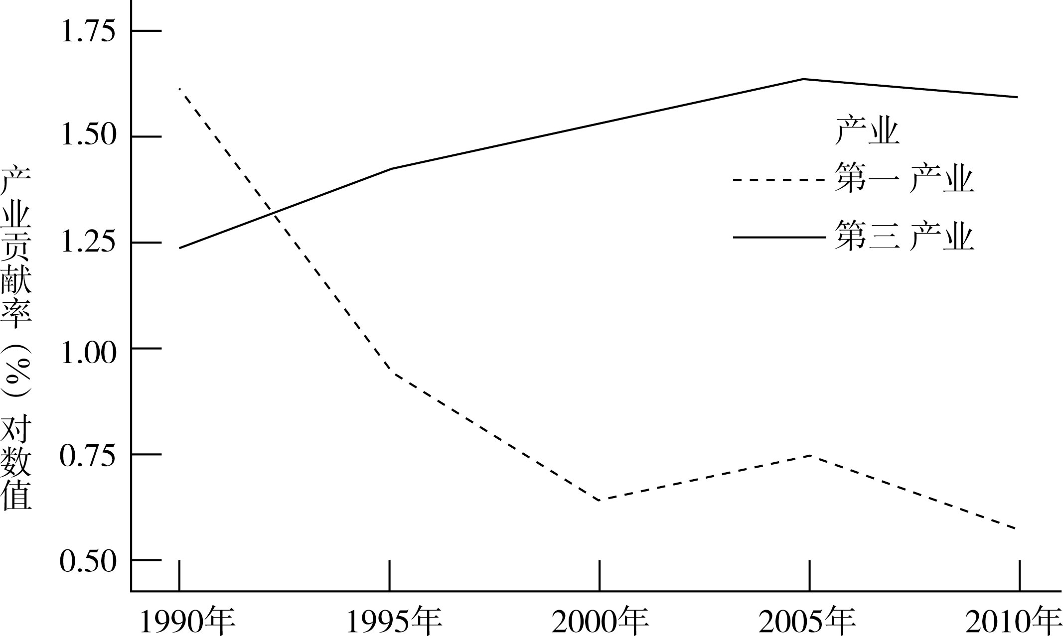 对比图3-6与图3-7,可以看到1990~2010年我国第一产业贡献率变化的幅度与速度均大于第三产业。
