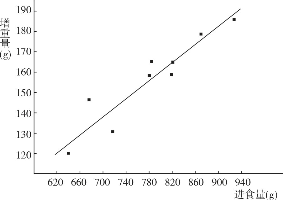 4.散点图(scatter diagram) 主要用于双变量资料的相关分析,以判断两变量间是否存在相关关系,以及相关的方向和密切程度。散点图的横轴和纵轴各代表一个变量;以直角坐标系中的点表示各研究对象,每个点的横坐标和纵坐标分别对应两个变量数值的大小;通过直角坐标系中各点的密集程度和趋势来表示两变量间的关系。横轴和纵轴尺度的起点不一定从0开始,可根据资料实际情况而定。如图3-5显示10只大白鼠进食量与增重量之间的关系。