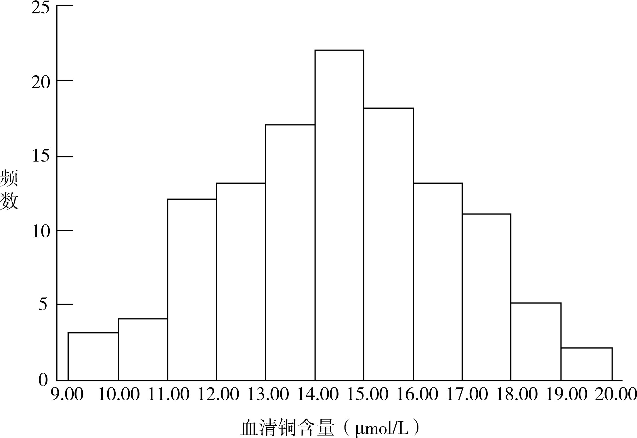 从表3-4可看出,健康成人血清铜含量主要集中在11.00~18.00(μmol/L),而小于11.00μmol/L或大于18.00μmol/L的人数则较少。