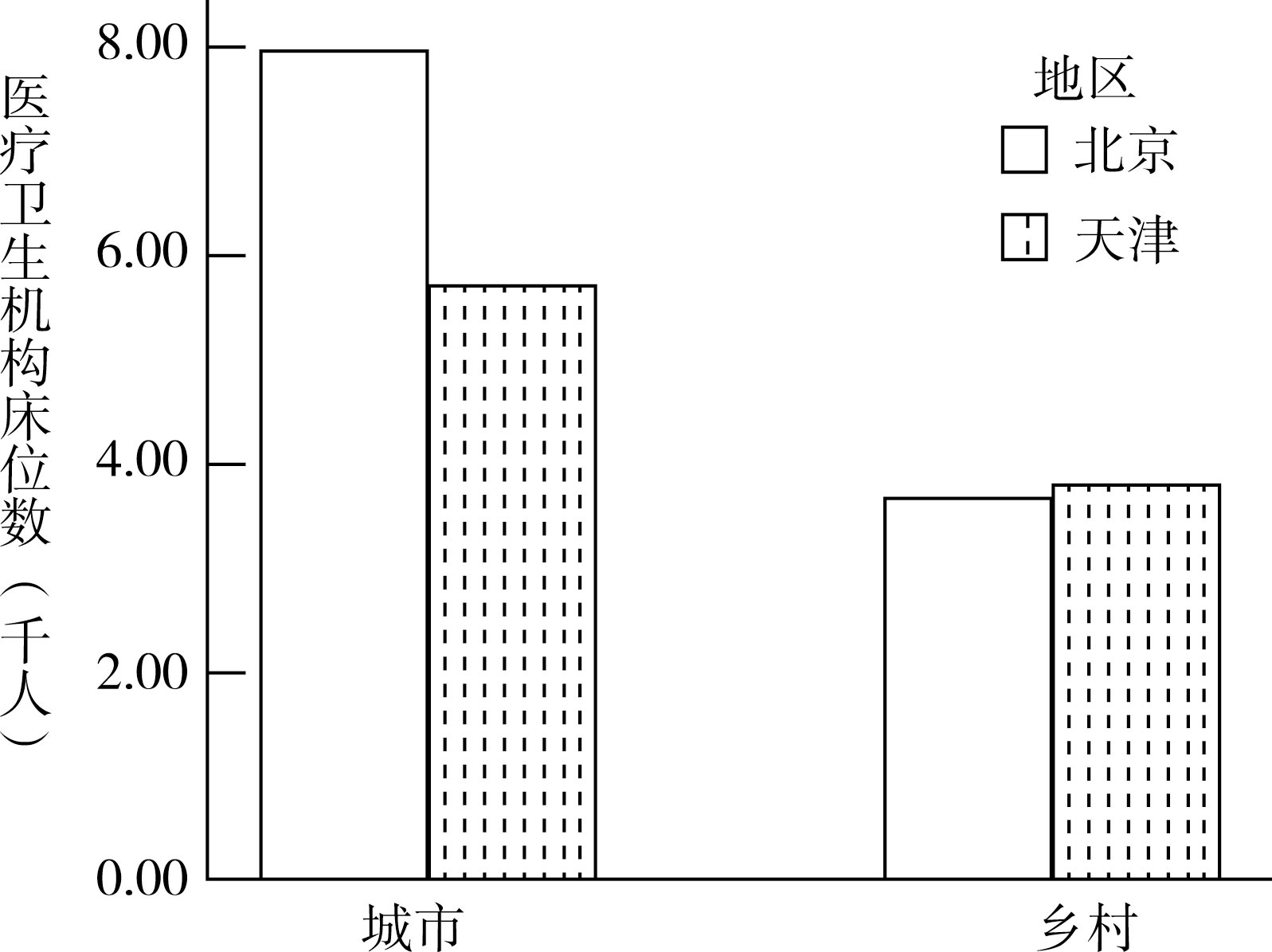 图3-3 2012年北京和天津两地城乡每千人口的医疗卫生机构床位数