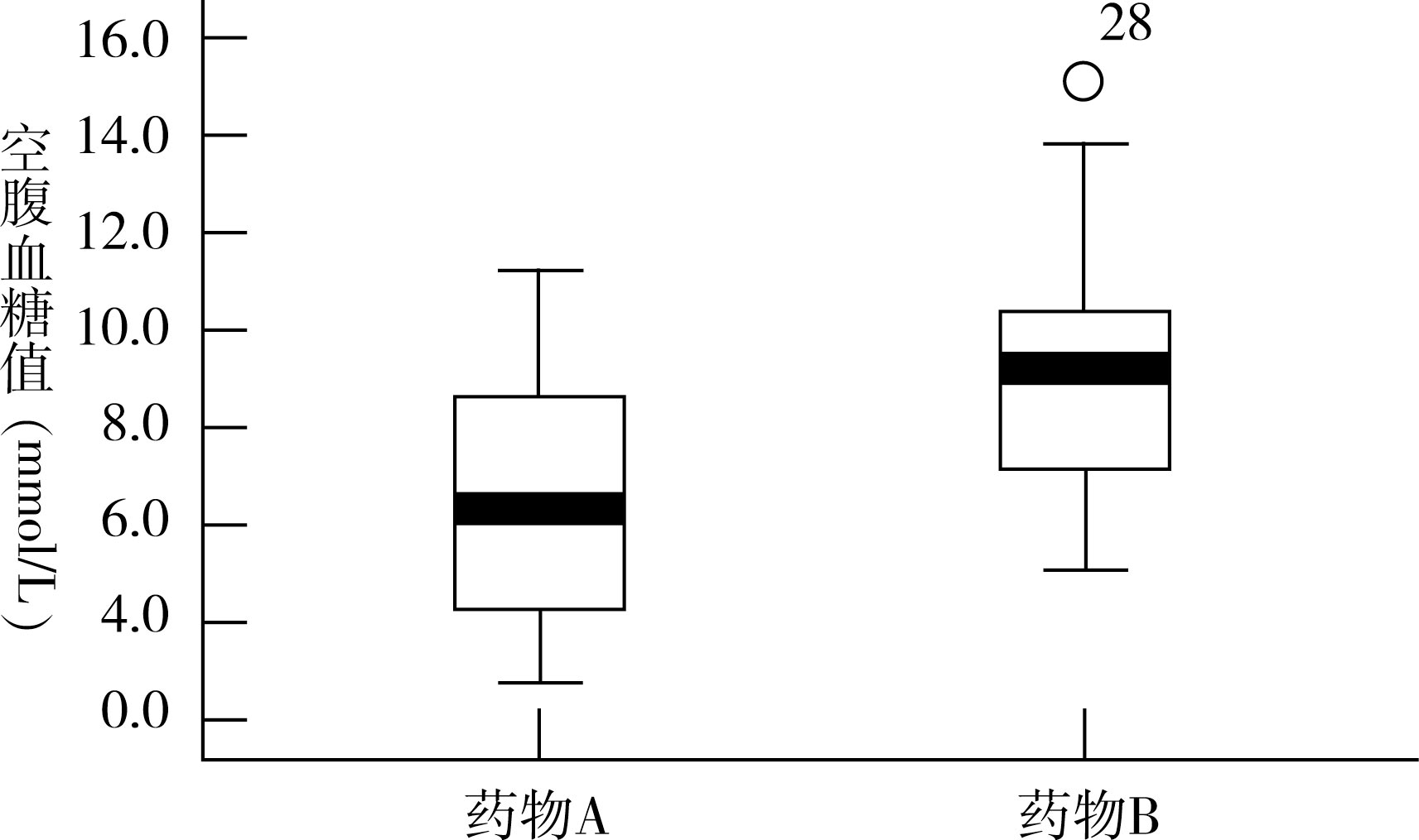 如图3-4为某地40名2型糖尿病患者使用药物A、B治疗后空腹血糖值的箱式图。可以看出,两种药物治疗后患者空腹血糖值的分布可能都是偏态分布;使用药物A治疗后空腹血糖值的平均水平低于药物B,变异程度高于药物B;药物B箱体上端出现了一个离群点,为28号数据。