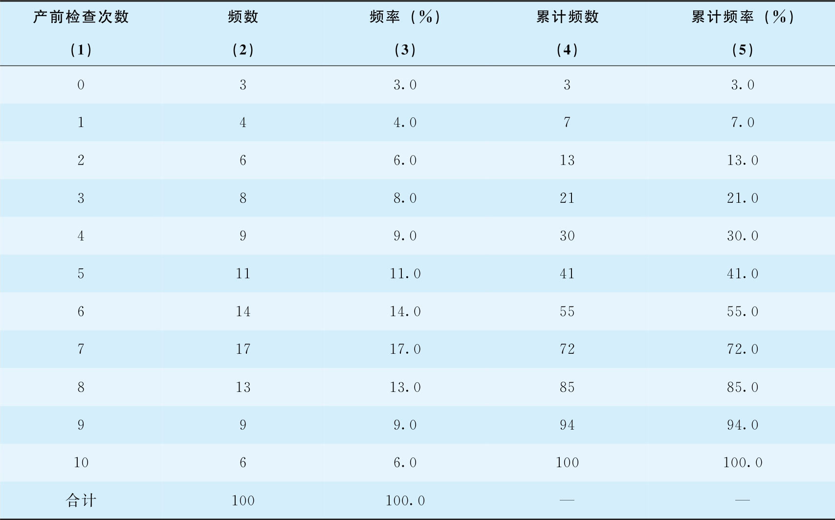 【例3-4】 某妇幼保健院对2013年住院分娩的100名产妇调查了产前检查次数,数据见表3-5,试对产前检查次数编制频数分布表。
