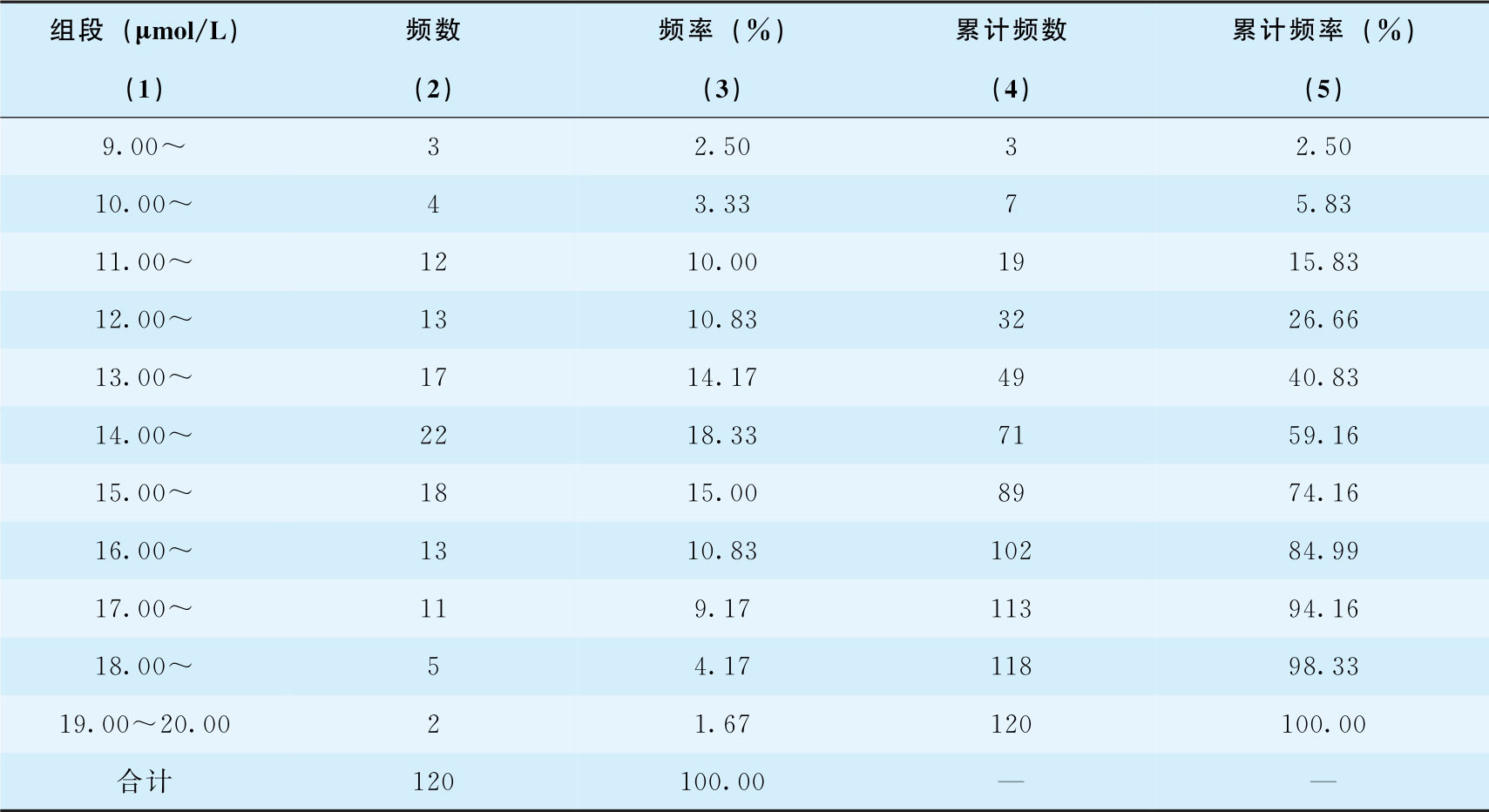 【例3-3】 2012年抽样调查某地120名健康成人血清铜含量(μmol/L),数据见表3-3,试编制血清铜含量的频数分布表。
