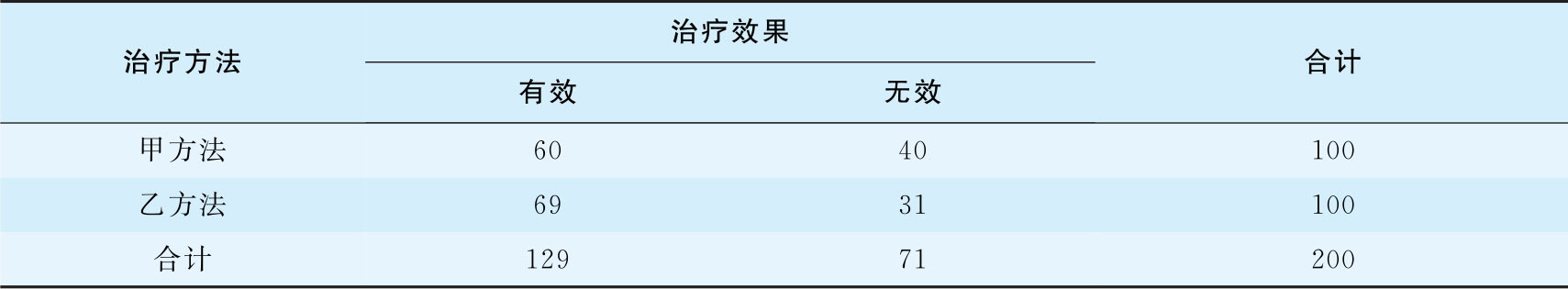 对分类型资料,若将研究对象同时按照两种属性加以划分,并清点各类别中研究对象的频数,由此形成的表格即为列联表。详见第十三章。如表3-8显示两种疗法治疗200名乙肝患者的疗效。