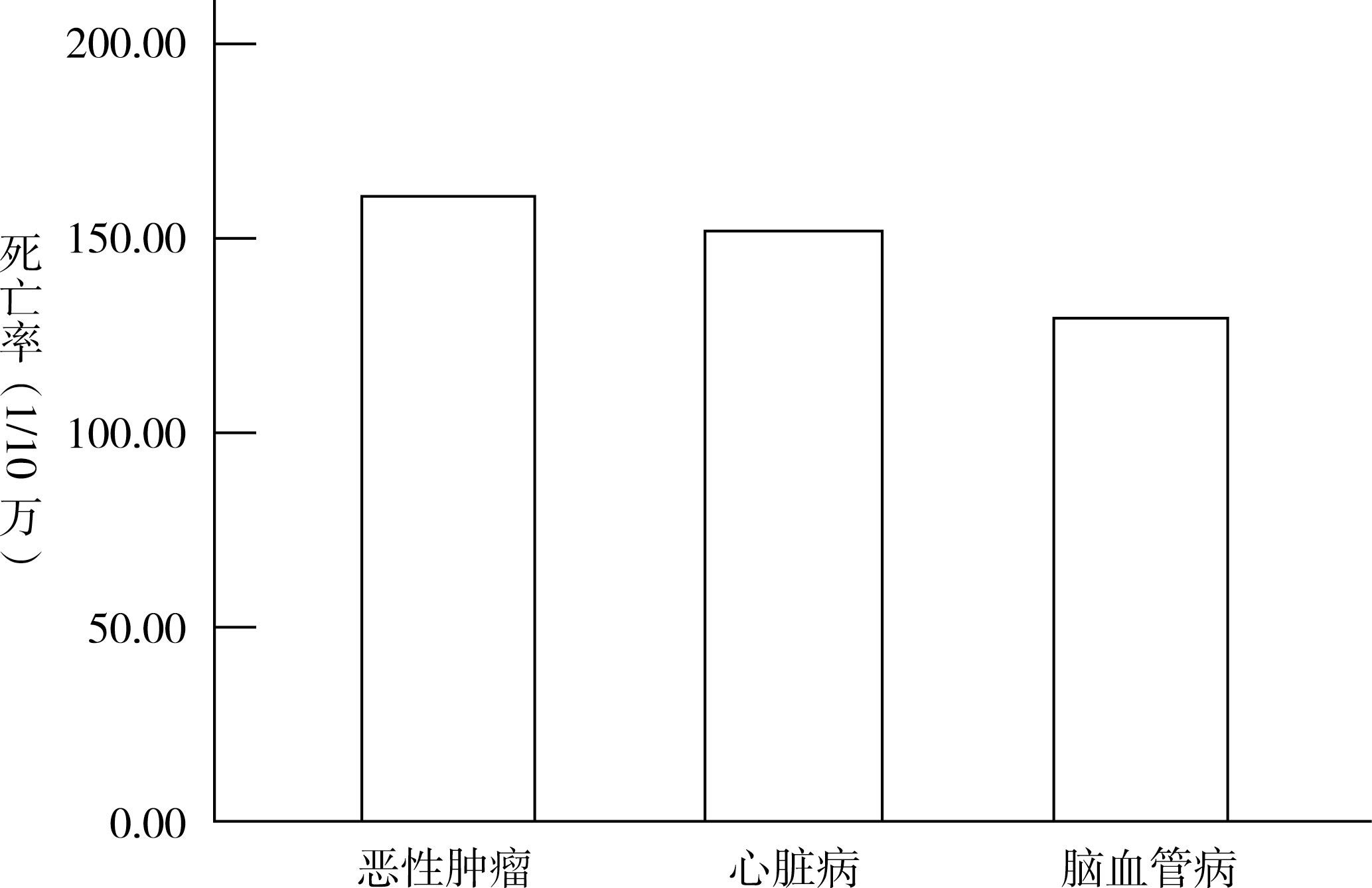 1.直条图(bar chart) 用于反映相互独立的事物之间的数量对比关系,适用于离散型数值变量和分类变量。如图3-8表示2012年北京市居民前三位死因的死亡率大小。