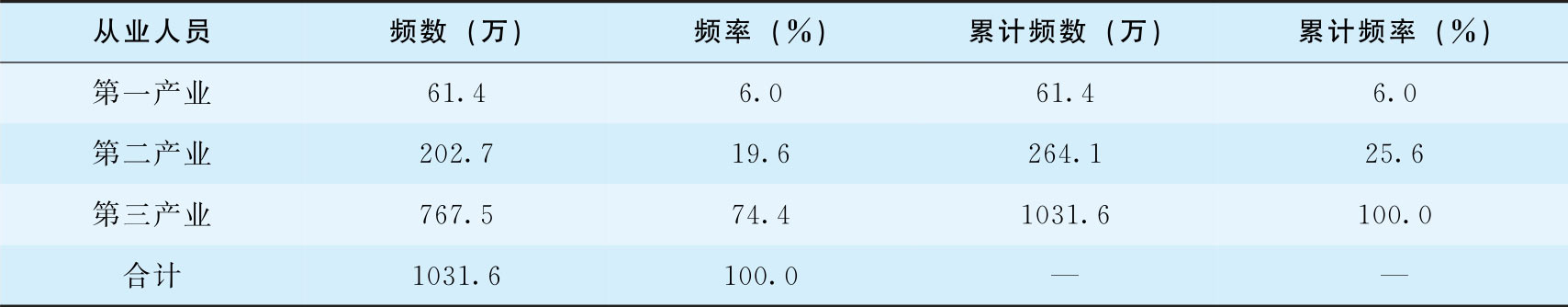 表3-7显示,2010年底北京市从业人员主要分布在第三产业,其次为第二产业,第一产业的频数和频率最小。