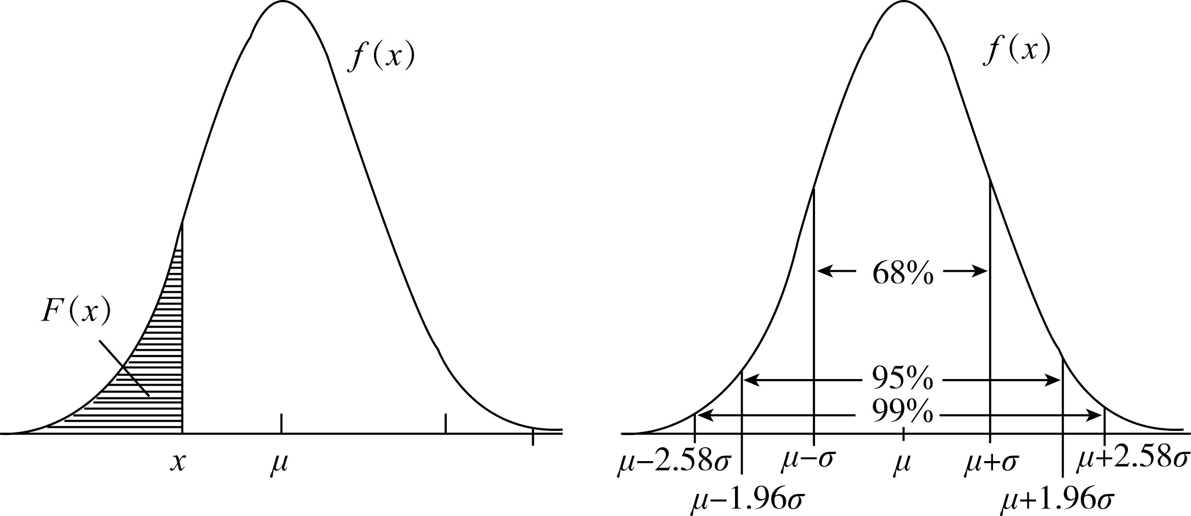 如图4-2左图所示, F ( x )称为分布函数, F ( x )= P ( X < x ),表示从负无穷大到 x 的曲边梯形面积,是正态随机变量的累积概率。如图4-2右图所示,曲线下方面积总和等于1, μ ± σ 约占总面积的68%, μ ±1.96 σ 约占总面积的95%, μ ±2.58 σ 约占总面积的99%。