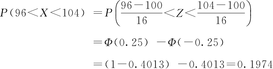 【例4-1】 设女性高血压患者的舒张压μ=100mm Hg,σ=16mm Hg,血压 X ~ N (100,16),求:(1) P ( X <90);(2) P ( X >124);(3) P (96< X <104);(4)求 x ,使 P ( X ≤ x )=0.95。