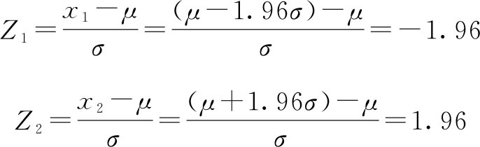 查附表4, Φ (-1.96)=0.025, Φ (1.96)=0.975,由对称性得到 X 取值在 μ ±1.96 σ 上的概率为1-2×0.025=95%,即 X 落在 μ ±1.96 σ 上的概率为95%。同理可求得 X 取值在 μ ±2.58 σ 上的概率为99%。