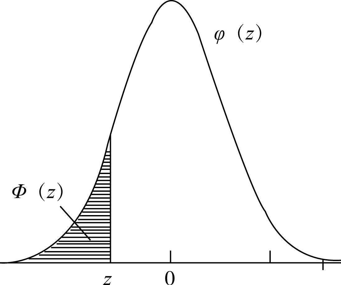 图4-3中的阴影部分 Φ ( z )是标准正态分布函数,它是标准正态随机变量的累积概率,是从负无穷大到 z 处的标准正态分布概率密度函数曲线下的曲边梯形的面积。