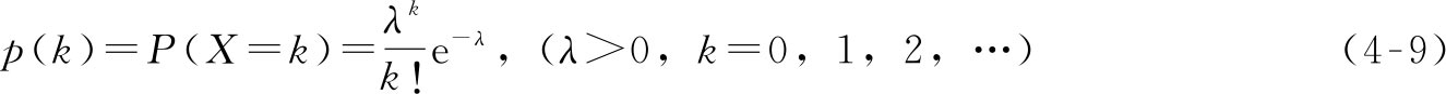 实际问题中,贝努里试验在 n ≥50、 p ≤0.1时,可认为是泊松总体,事件 A 出现的次数 X ~ P ( k , λ )。在 n 、 p 已知时取 λ = np ,在 n 、 p 不全知时取 λ =平均数/单元。