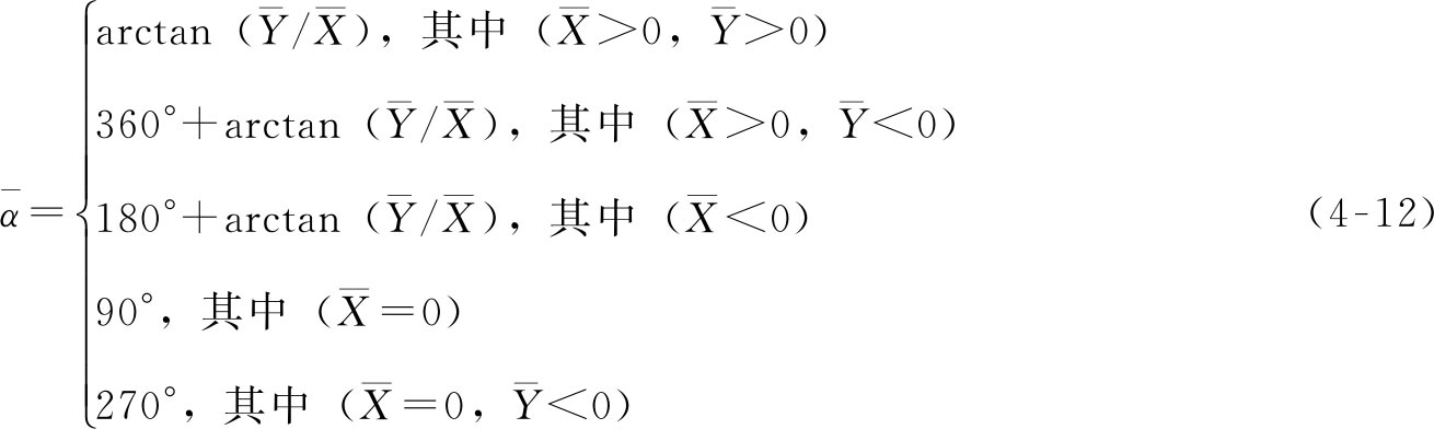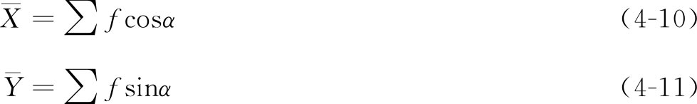 求出每个角度的正弦、余弦值,填入表4-5的④、⑤列。按⑥=②×④及⑦=②×⑤计算,求②、⑥、⑦列的和得到: