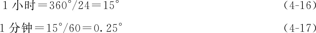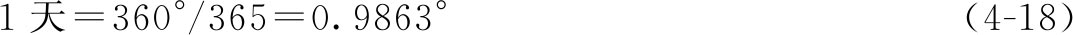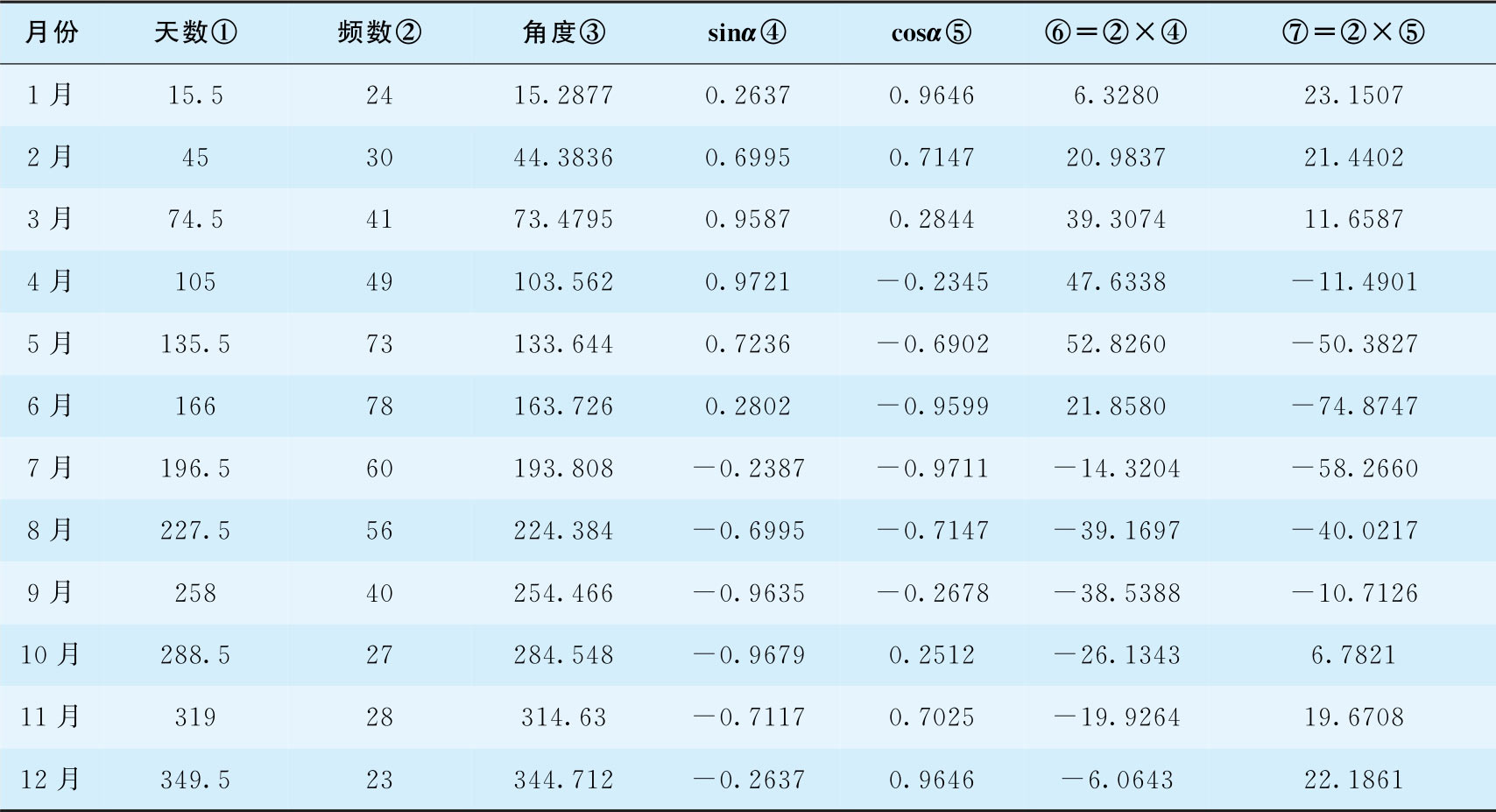 圆形分布的季节资料,要准确到月、日。1~12月份,分别计为31、28、31、30、31、30、31、31、30、31、30、31天。1年365天按360°计算,以元旦零时为起点,1天相当于: