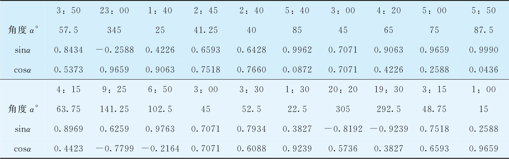 解: 这是单组昼夜时间资料。把分娩时间换成角度,计算每一角度的正弦值、余弦值,如表4-2所示。