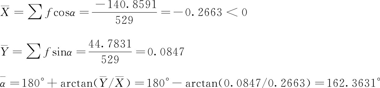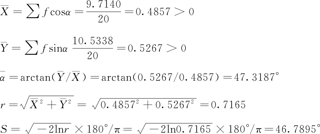平均角,也称角均数,用于描述圆形分布资料集中于某个角度或方向、时间中发生的倾向。 n 个以角度表示的数据 α i ( i =1,2,…, n ), f i 为分组频率,定义横、纵坐标均数为: