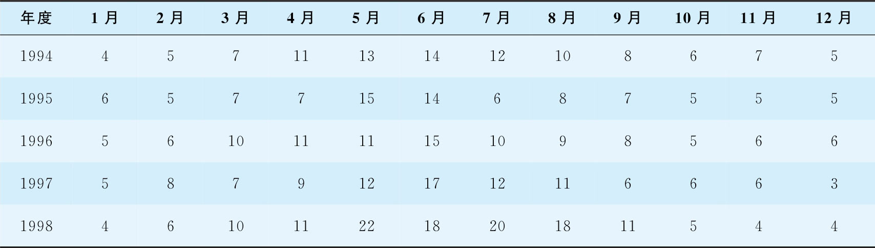 计算5年每月的意外死亡合计人数,填入表4-5的②列。将月中值折算成角度,填入表4-5的③列。一年365天,如,1月中点为15.5×360°/365=15.2877°。