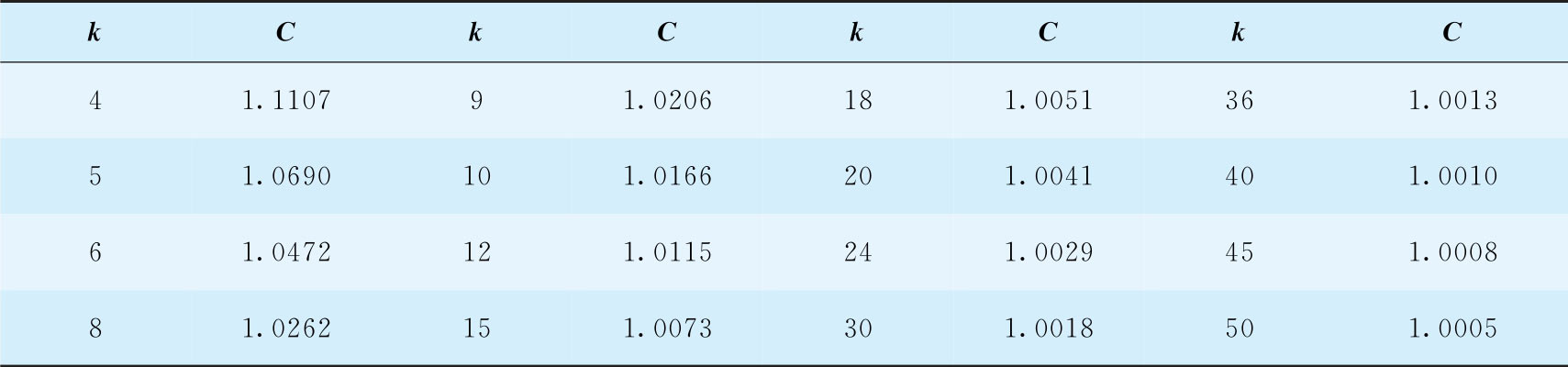 其中, C 为极距校正因子,其值可以根据组数 k 查表4-3得到。