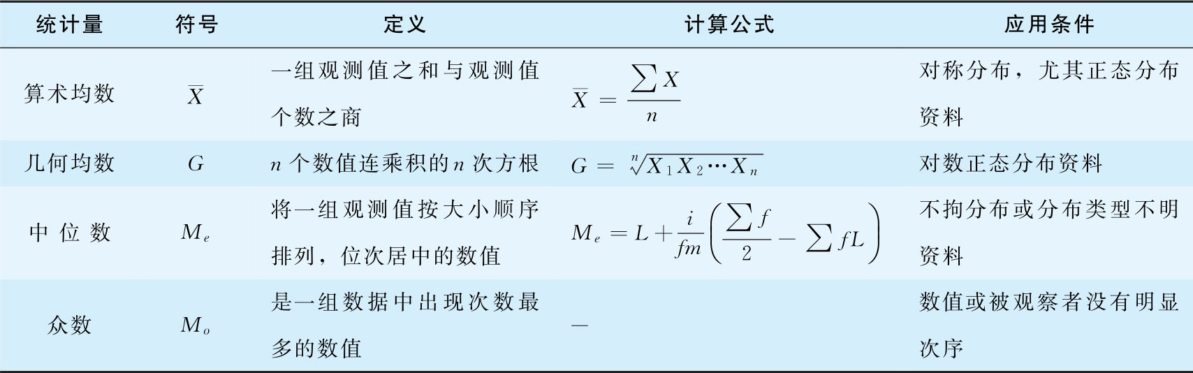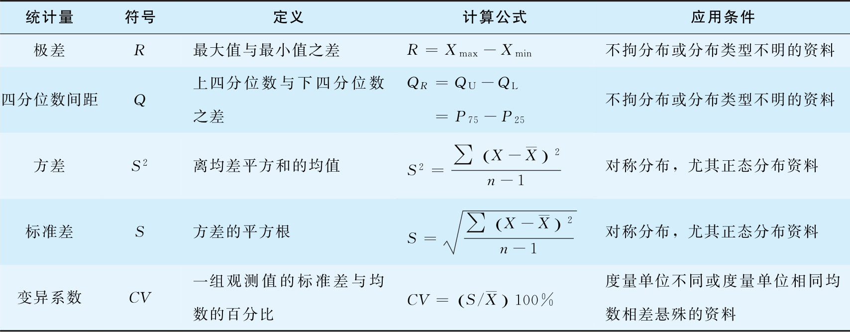 数值型资料集中趋势和离散程度描述的各指标的概念、计算方法和适用条件可以参考表5-1和表5-2。