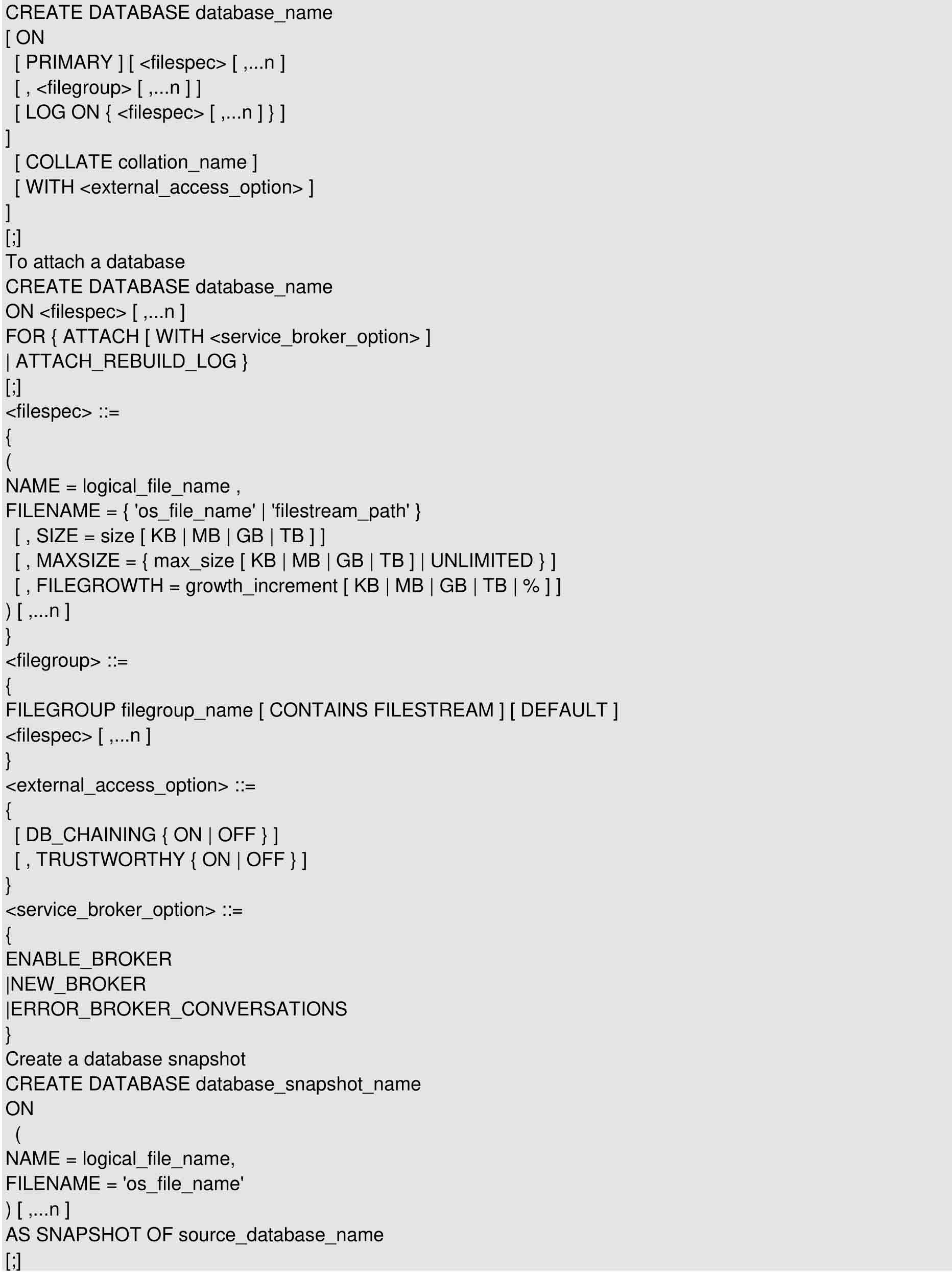 database_name:新数据库的名称。数据库名称在SQL Server的实例中必须唯一,并且必须符合标识符规则。