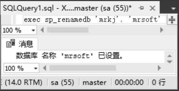 【例4.4】 使用系统存储过程sp_renamedb将数据库名称“mrkj”更名为“mrsoft”,如图4.9所示。 (实例位置:资源包\TM\sl\4\4)