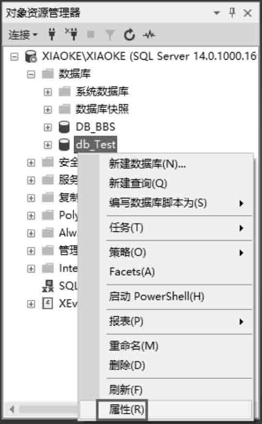 (2)右击需要更改的数据库,在弹出的快捷菜单中选择“属性”命令,如图4.5所示。