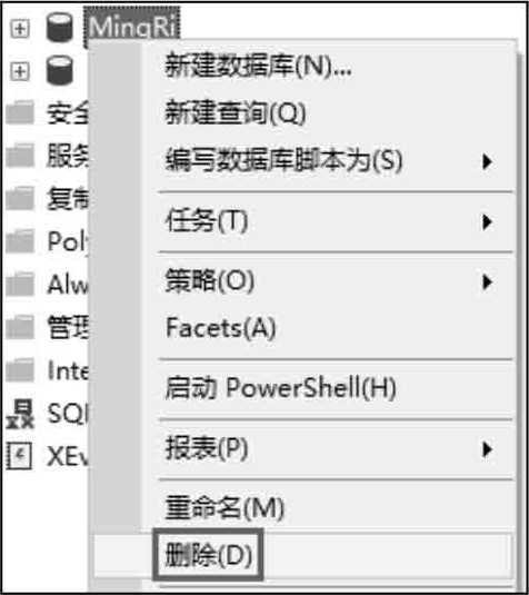 (2)右击要删除的数据库MingRi选项,在弹出的快捷菜单中选择“删除”命令,如图4.10所示。