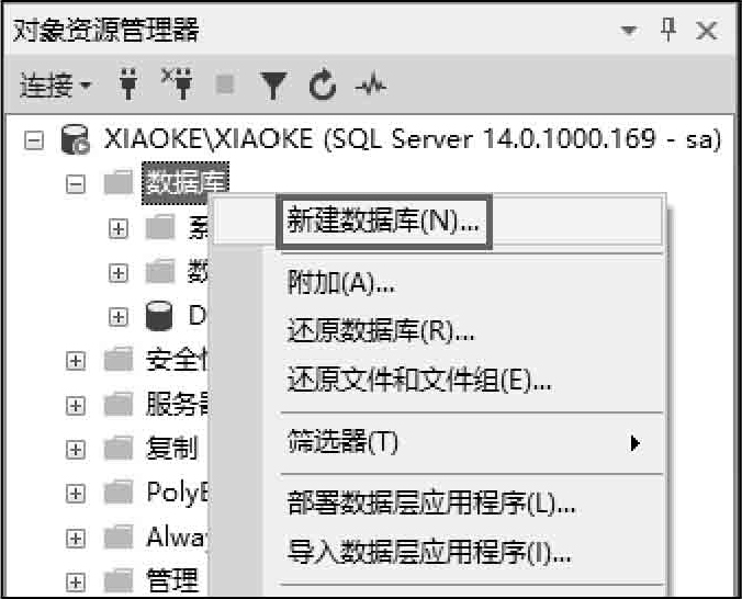(1)启动SQL Server Management Studio,并连接到SQL Server 2017服务器,在“对象资源管理器”中展开“数据库”节点。