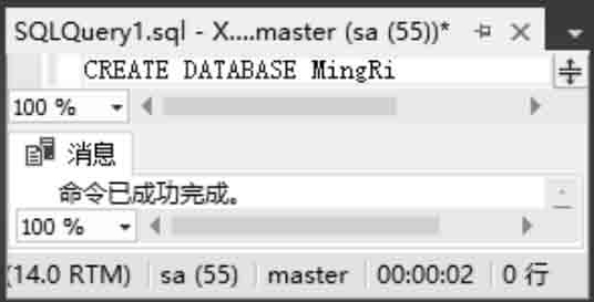 【例4.1】 用CREATE DATABASE命令创建一个名称为MingRi的数据库,如图4.3所示。 (实例位置:资源包\TM\sl\4\1)