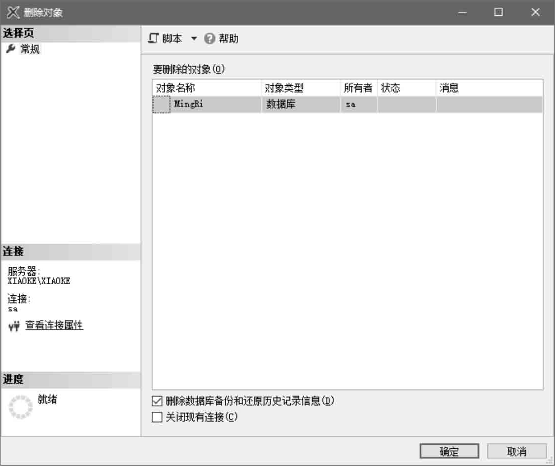 (3)在弹出的“删除对象”窗口中单击“确定”按钮即可删除数据库,如图4.11所示。