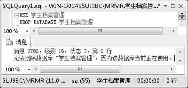 例如,不能在“学生档案管理”数据库中删除“学生档案管理”数据库,SQL代码如下: