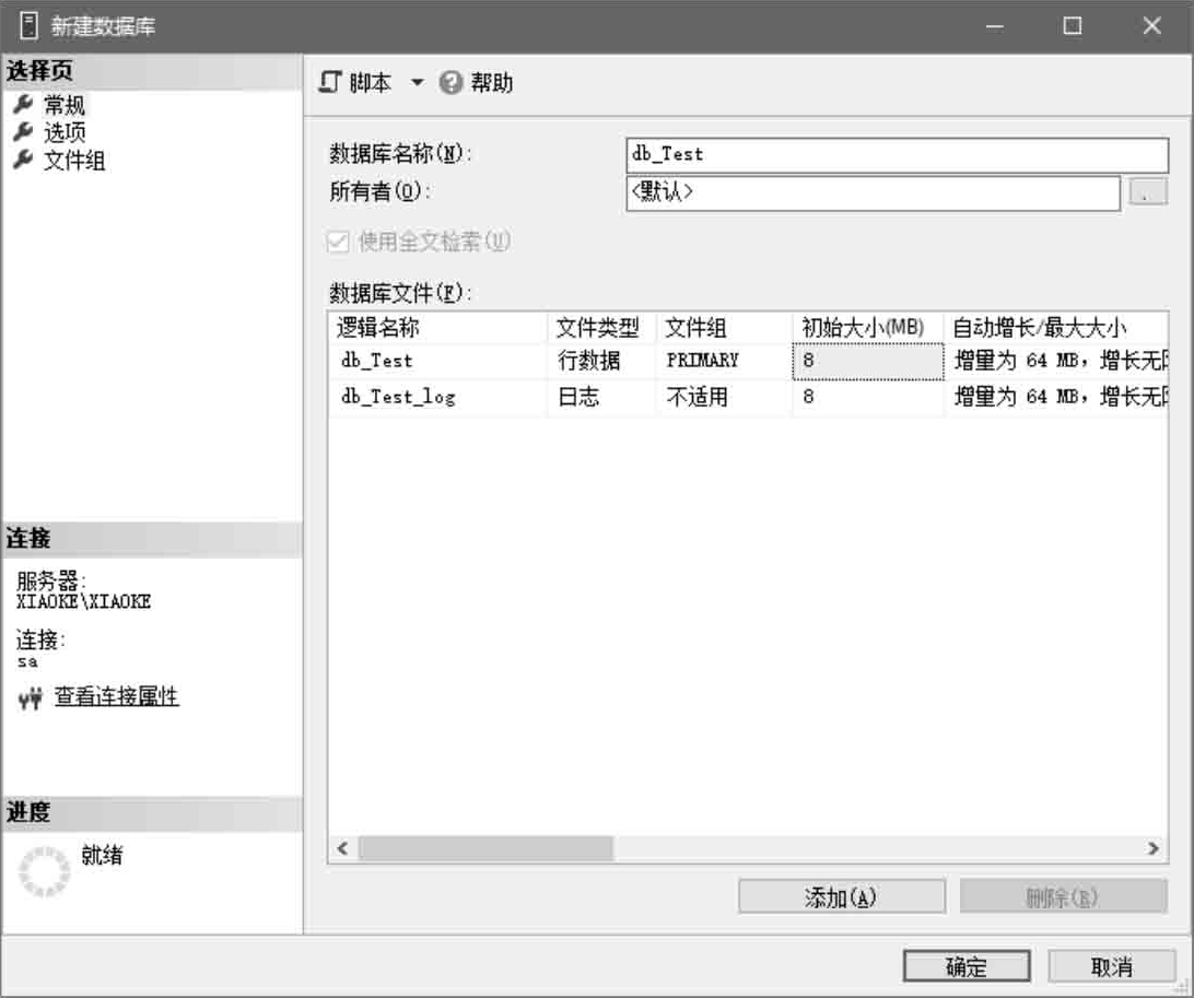 (5)在“数据库名称”文本框中输入新建数据库的名称“db_Test”,数据库名称设置完成后,系统自动在“数据库文件”列表中产生一个主要数据文件(初始大小为8MB)和一个日志文件(初始大小为8MB),同时显示文件组、自动增长和路径等默认设置,用户可以根据需要自行修改这些默认的设置,也可以单击右下角的“添加”按钮添加数据文件。这里主要数据文件和日志文件均采用默认设置。