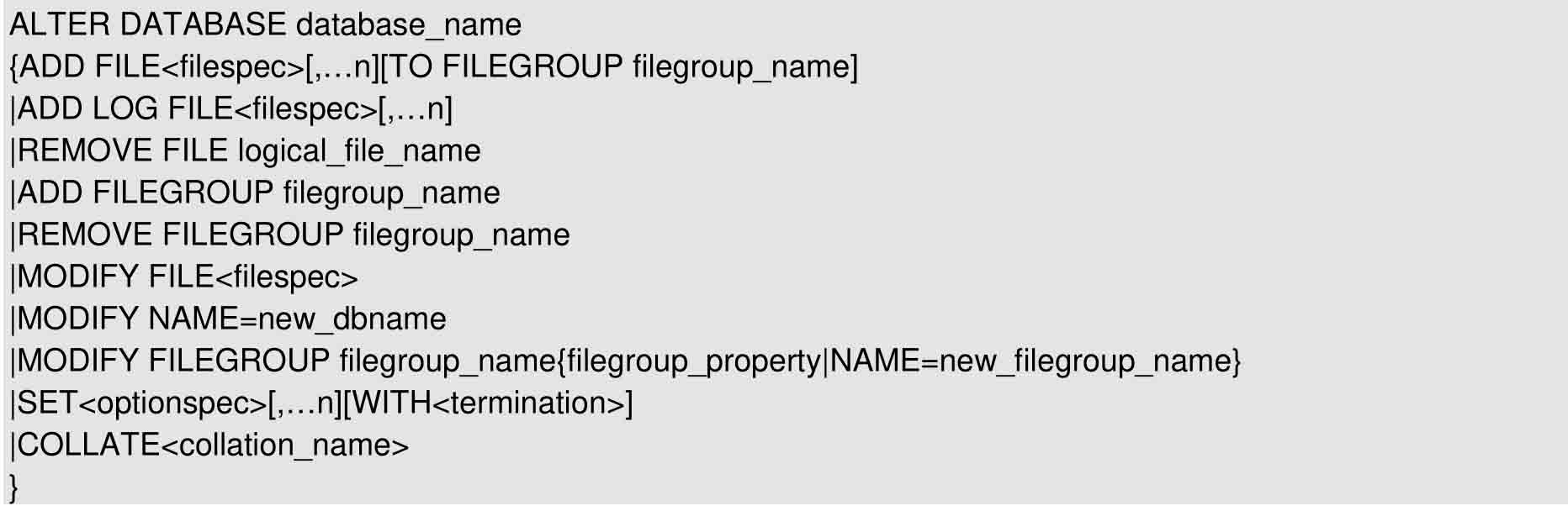 T-SQL中修改数据库的命令为ALTER DATABASE。语法格式如下:
