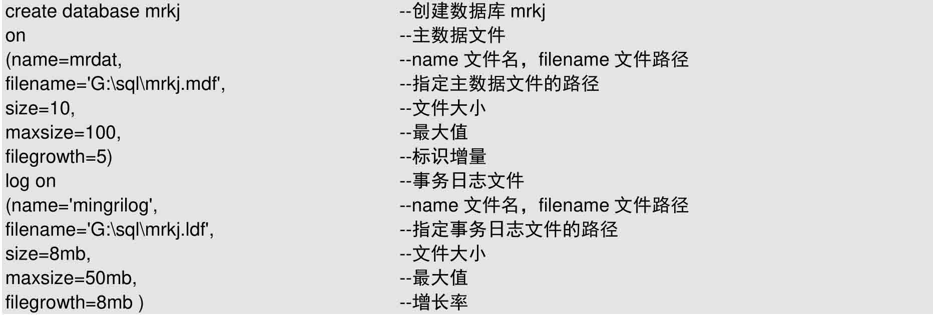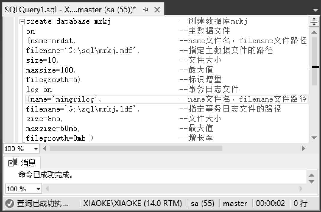 【例4.2】 在SQL Server管理器中,使用CREATE DATABASE命令创建名为mrkj的数据库。其中,主数据文件名称是mrkj.mdf,初始大小是10MB,最大存储空间是100MB,增长大小是5MB。而日志文件名称是mrkj.ldf,初始大小是8MB,最大的存储空间是50MB,增长大小是8MB,如图4.4所示。 (实例位置:资源包\TM\sl\4\2)