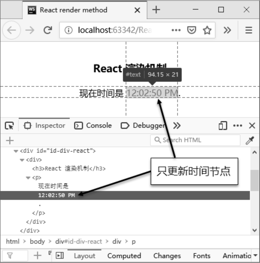下面使用Firefox浏览器运行测试该HTML网页,具体效果如图1.11所示。如图上的箭头和标识所示,页面效果显示通过React渲染方式,仅仅只更新时间元素节点。