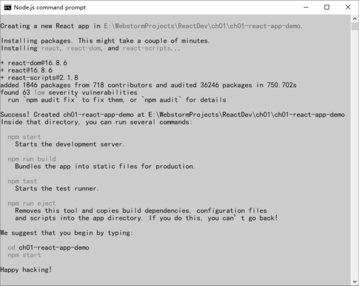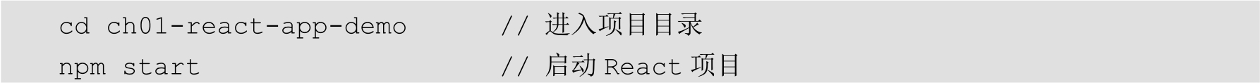 以上这两种通过“create-react-app”脚手架创建React项目的方式,虽然过程有所区别,但最终效果是一样的。图1.4所示是React项目创建完成后的提示信息。
