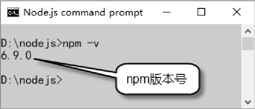 (3)判断npm包管理工具是否同时安装成功。判断方法同样很简单,直接在命令行控制台中通过“npm -v”命令查看版本号。如果能够显示出版本号,就表示npm工具也安装成功了,具体如图1.3所示。
