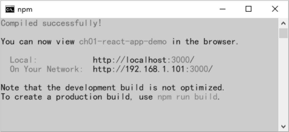 如果通过“npm start”命令启动React项目成功,控制台终端中会给出正确的提示信息,如图1.5所示。