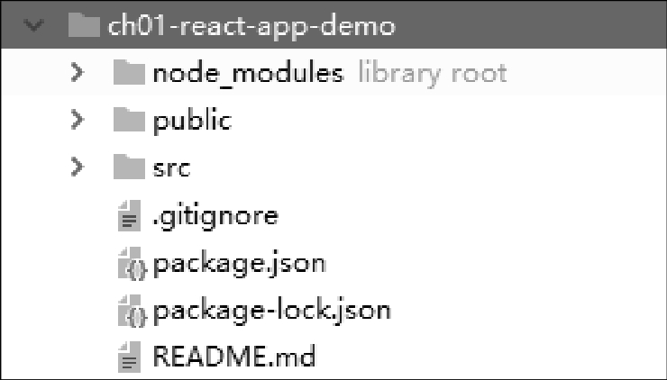 图1.7展示的是一个最基本的React脚手架项目架构。需要说明的是,随着“create-react-app”脚手架应用的不断迭代更新,目录结构和文件名称可能会有修订,不过基本原理还是会保持延续。