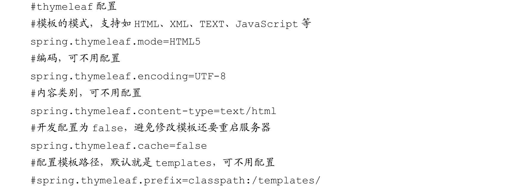 同时还需要在application.properties文件中添加Thymeleaf配置,具体代码如下:
