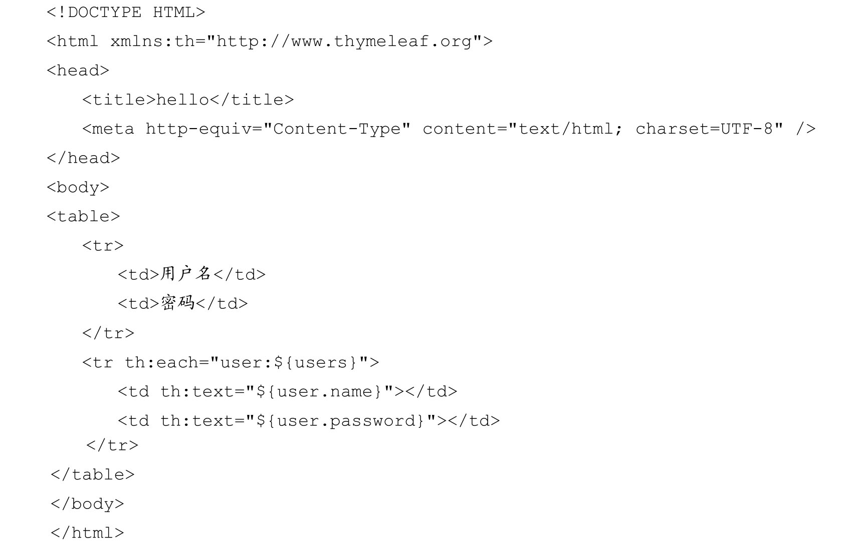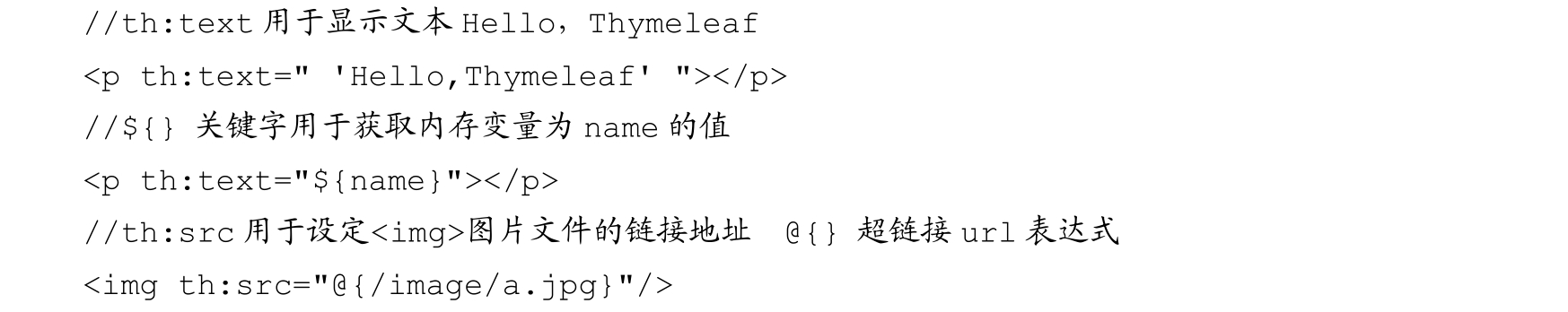 <html xmlns:th="http://www.thymeleaf.org">是Thymeleaf命名空间,通过引入该命名空间,就可以在HTML文件中使用Thymeleaf标签语言,用关键字“th”来标注。下面看几个简单的例子: