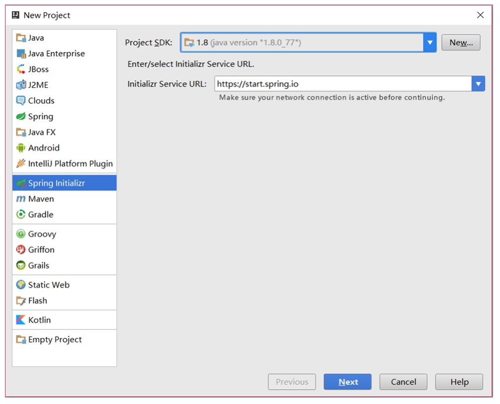 在Intellij IDEA界面中,单击【File】→【New】→【Project】,在弹出的窗口中选择【Spring Initializr】选项,在【Project SDK】选择JDK的安装路径,如果没有则新建一个,单击【Next】按钮,如图1-7所示。