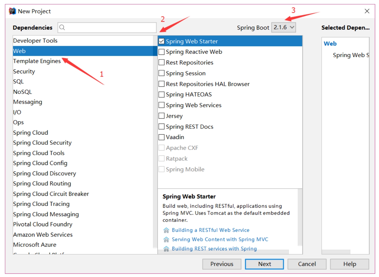 选择【Spring Boot Version】,这里按默认版本(本书使用的Spring Boot版本为2.1.6)即可。勾选【web】→【Spring Web Starter】选项,然后单击【Next】按钮,如图1-8所示。